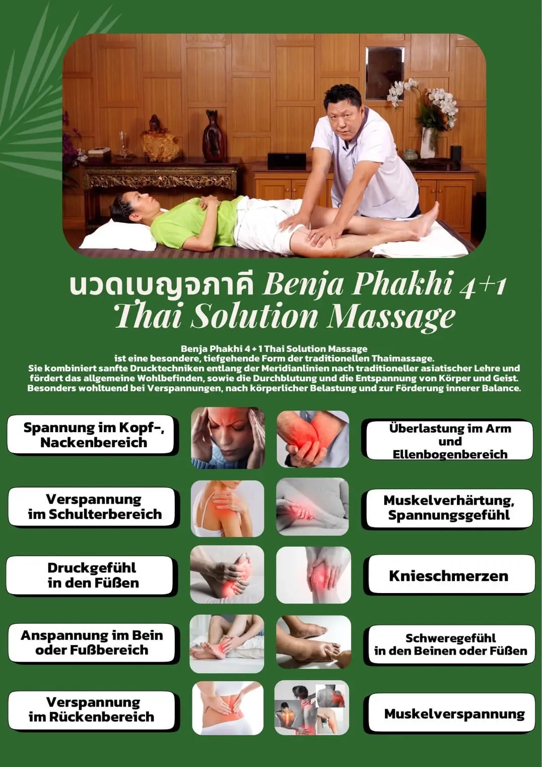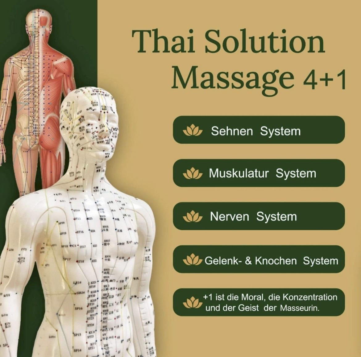 Die Thai Solution Massage ist eine moderne, lösungsorientierte Weiterentwicklung der traditionellen Thai-Massage, die gezielte Drucktechniken (Akupressur), sanfte Dehnungen und Faszienarbeit kombiniert, um Energieblockaden, Verspannungen und Schmerzen zu lindern, die Beweglichkeit zu fördern und das Gleichgewicht im Körper wiederherzustellen.