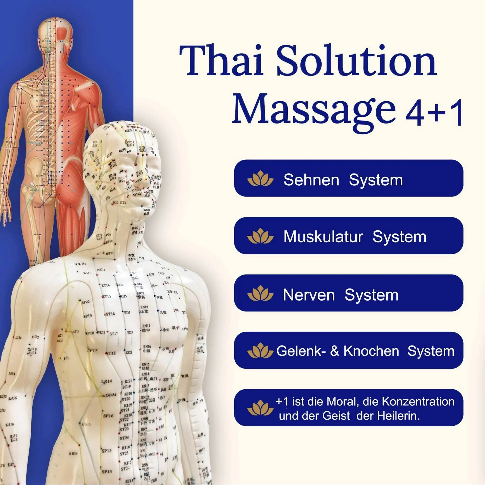 Thai Solution Massage is a modern, solution-focused development of traditional Thai massage that combines targeted pressure techniques (acupressure), gentle stretches, and fascia work to relieve energy blockages, tension, and pain, promote mobility, and restore balance in the body.
